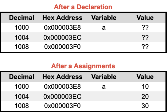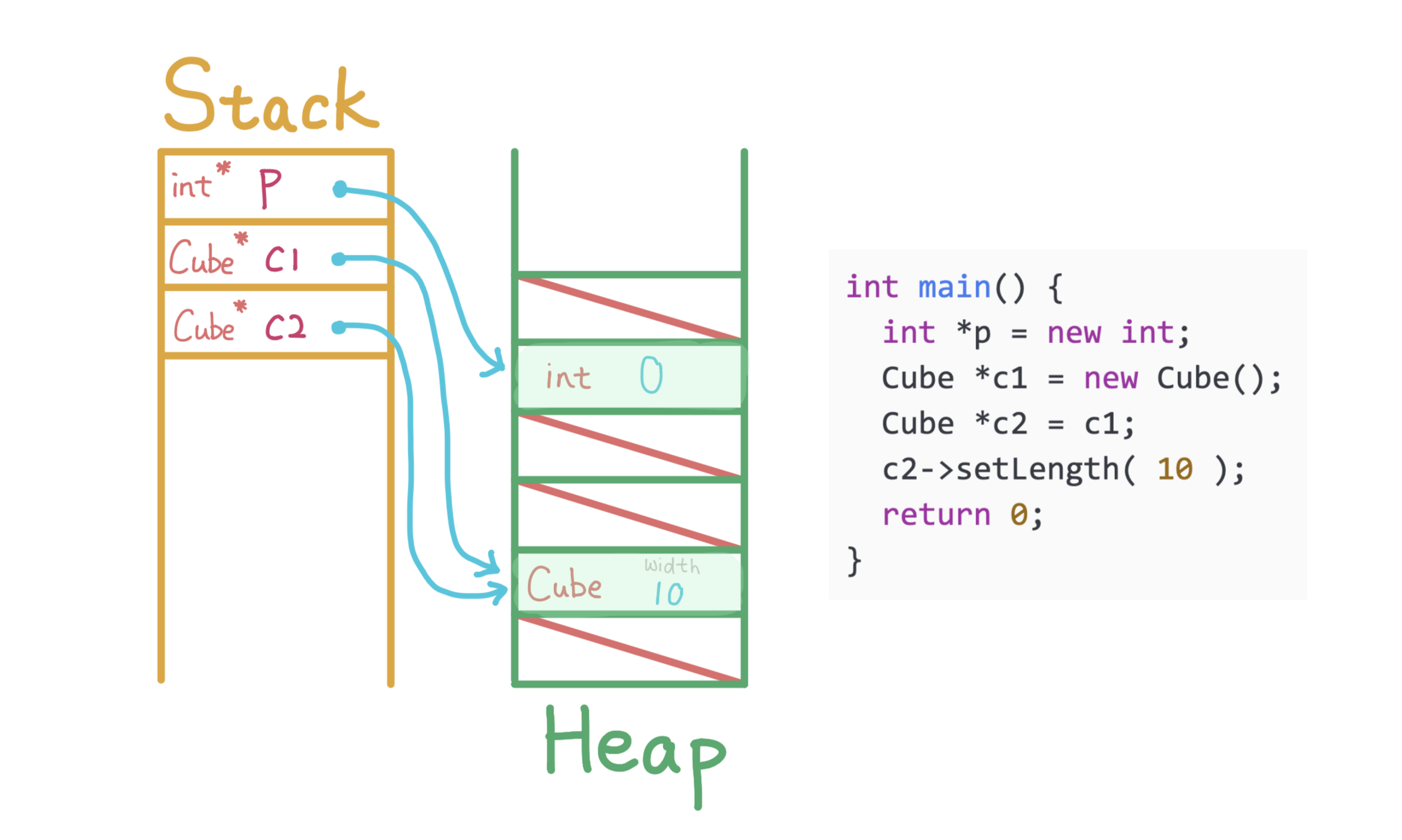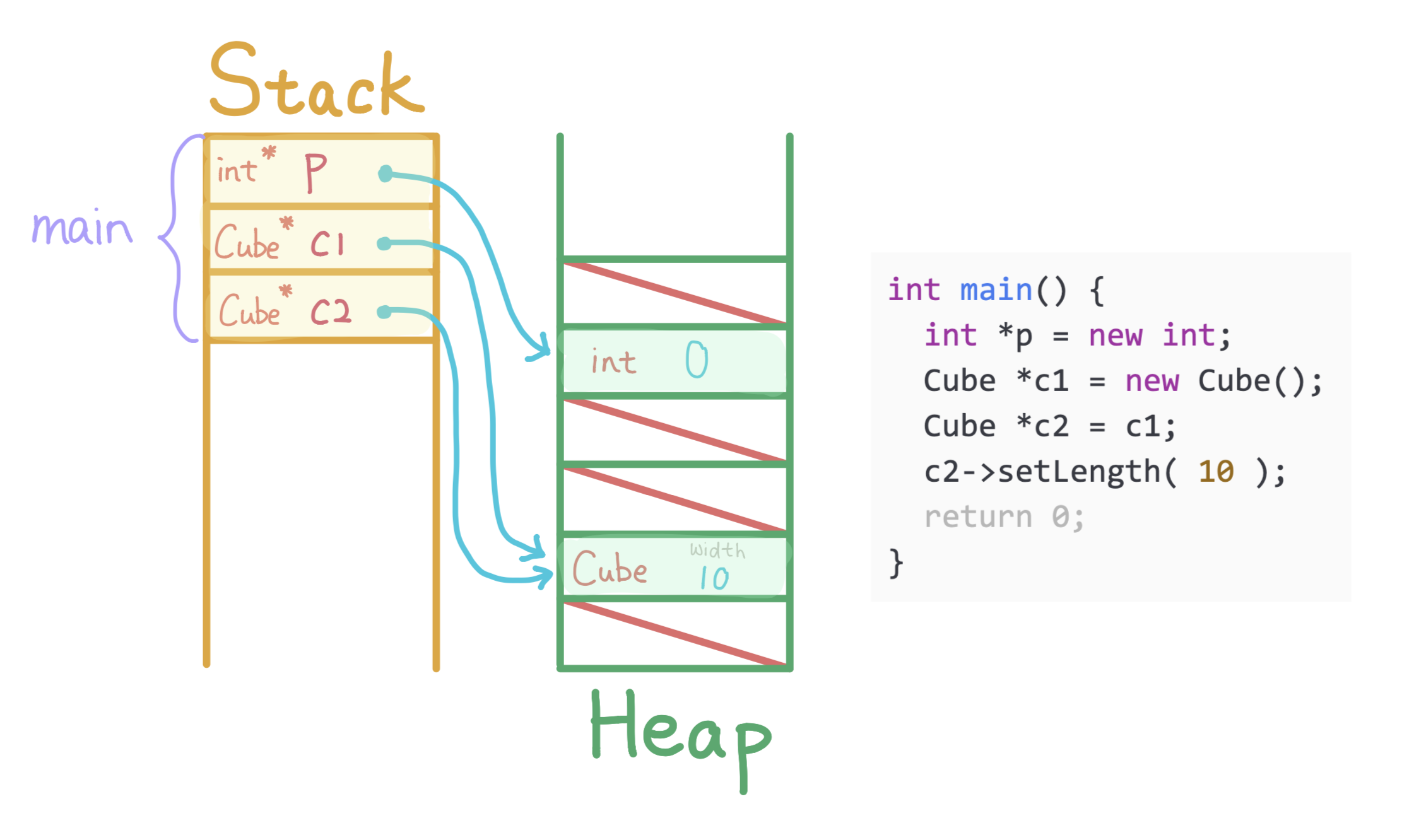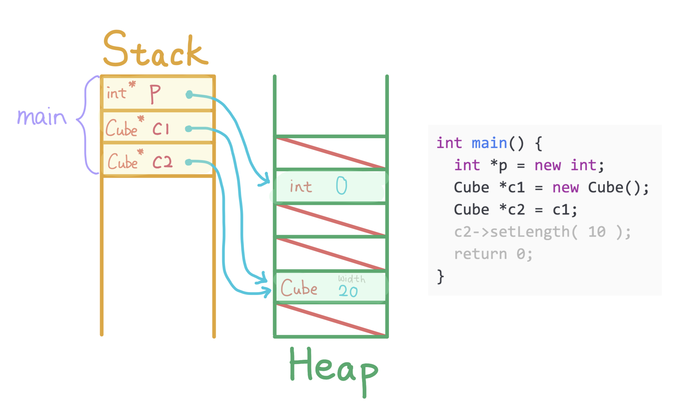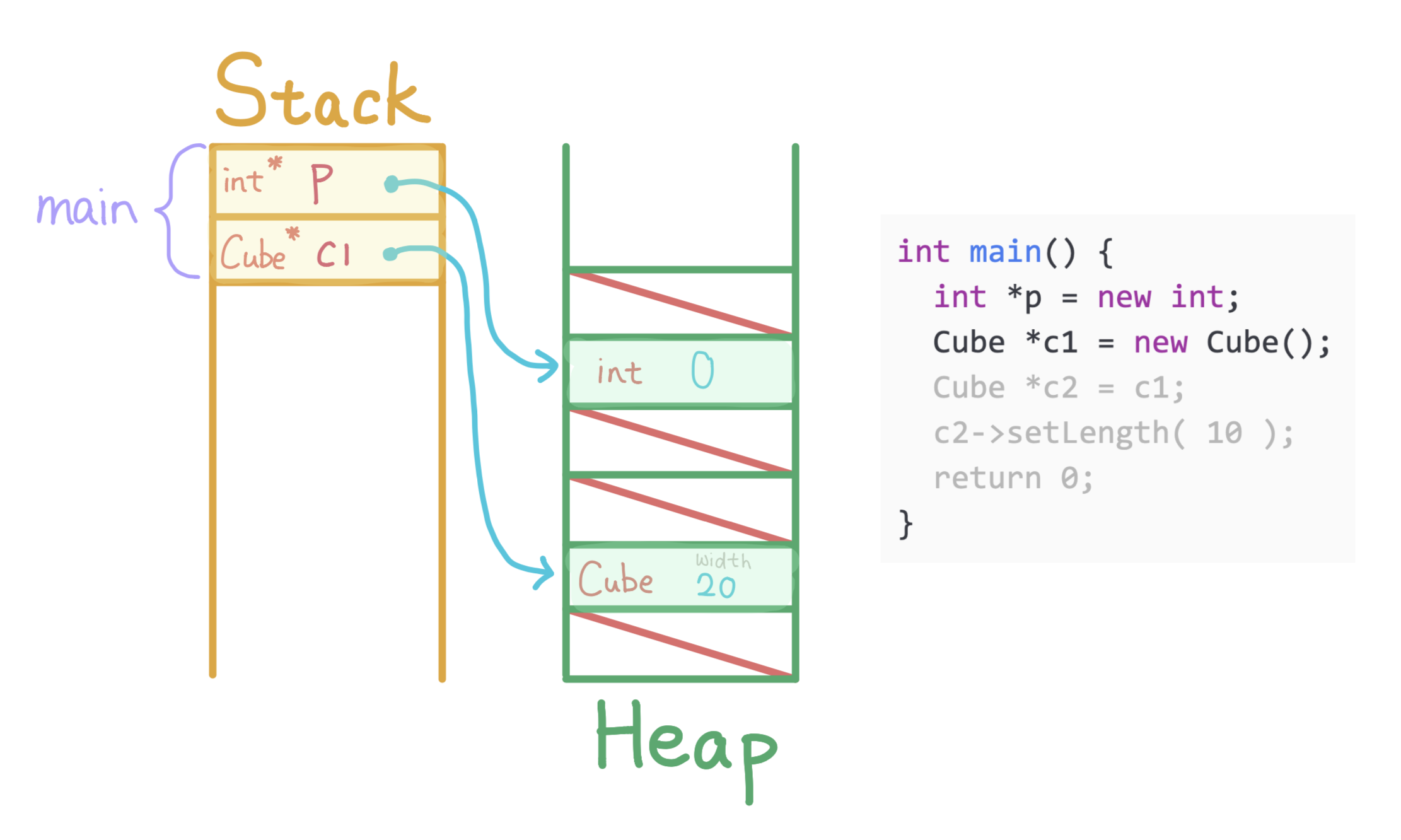 Allocate a Cube with default width 20 on the heap, allocate c1 on main's stack to store the address of the Cube