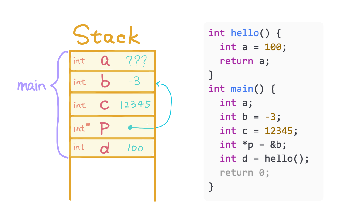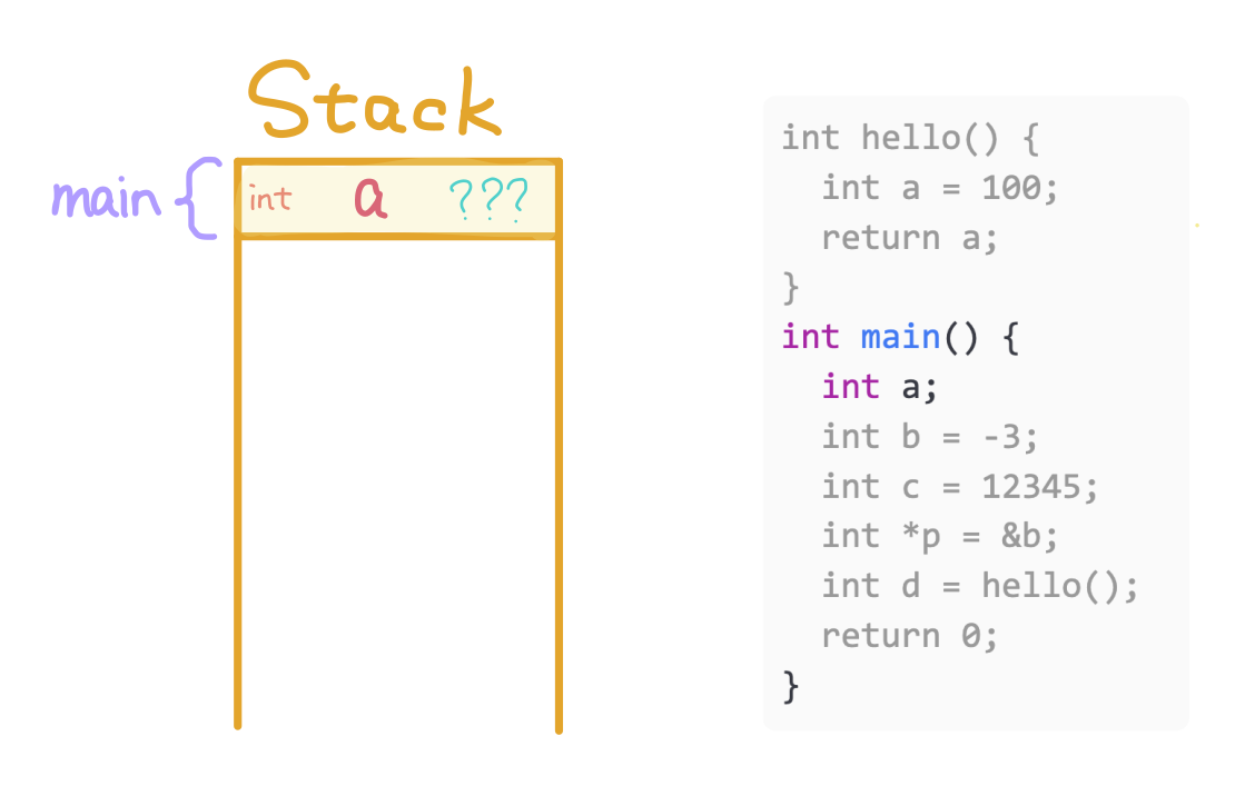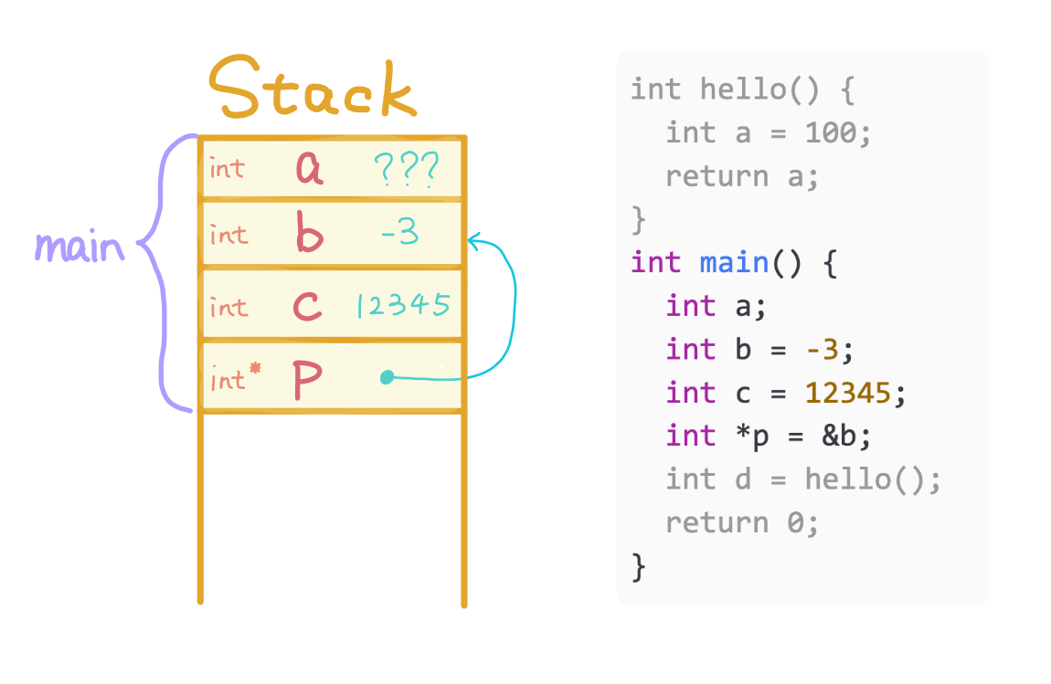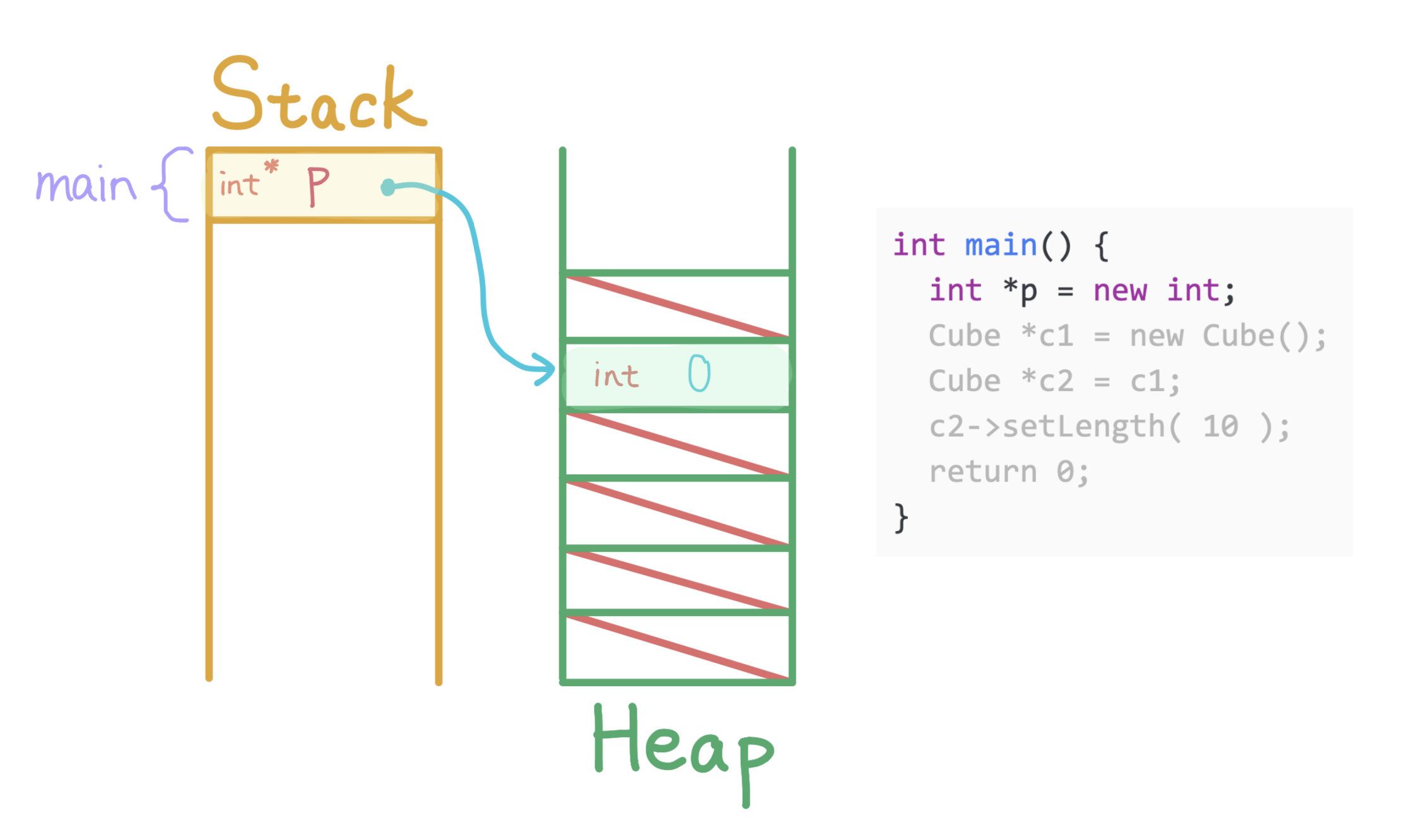 Allocate an integer with default value 0 on the heap, allocate p on main's stack to store the address of the integer