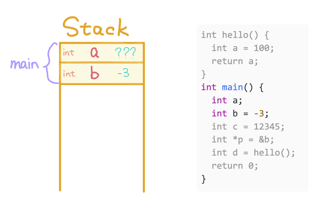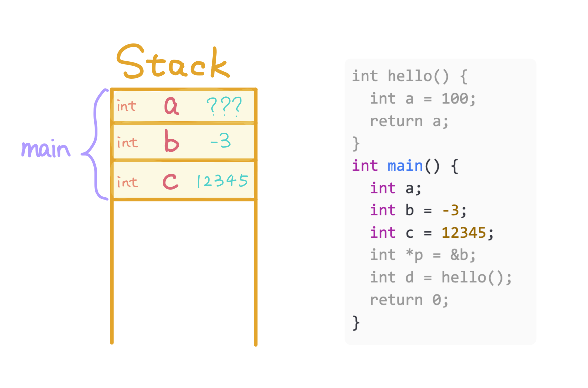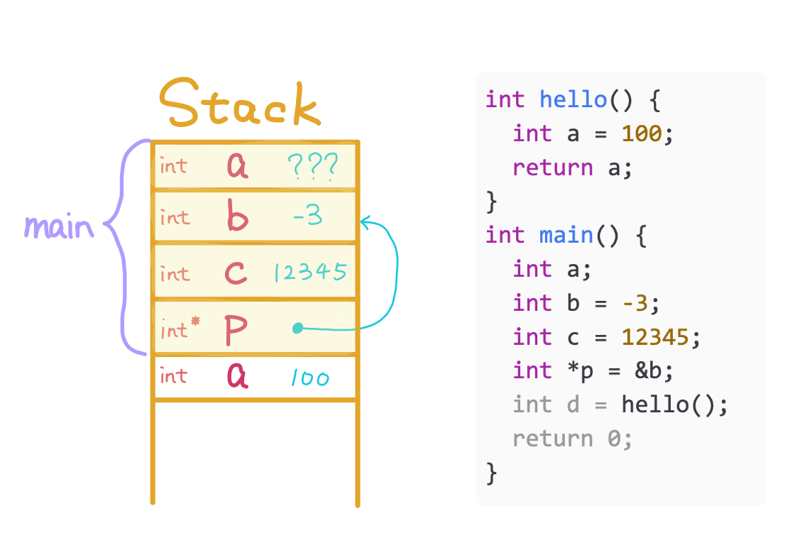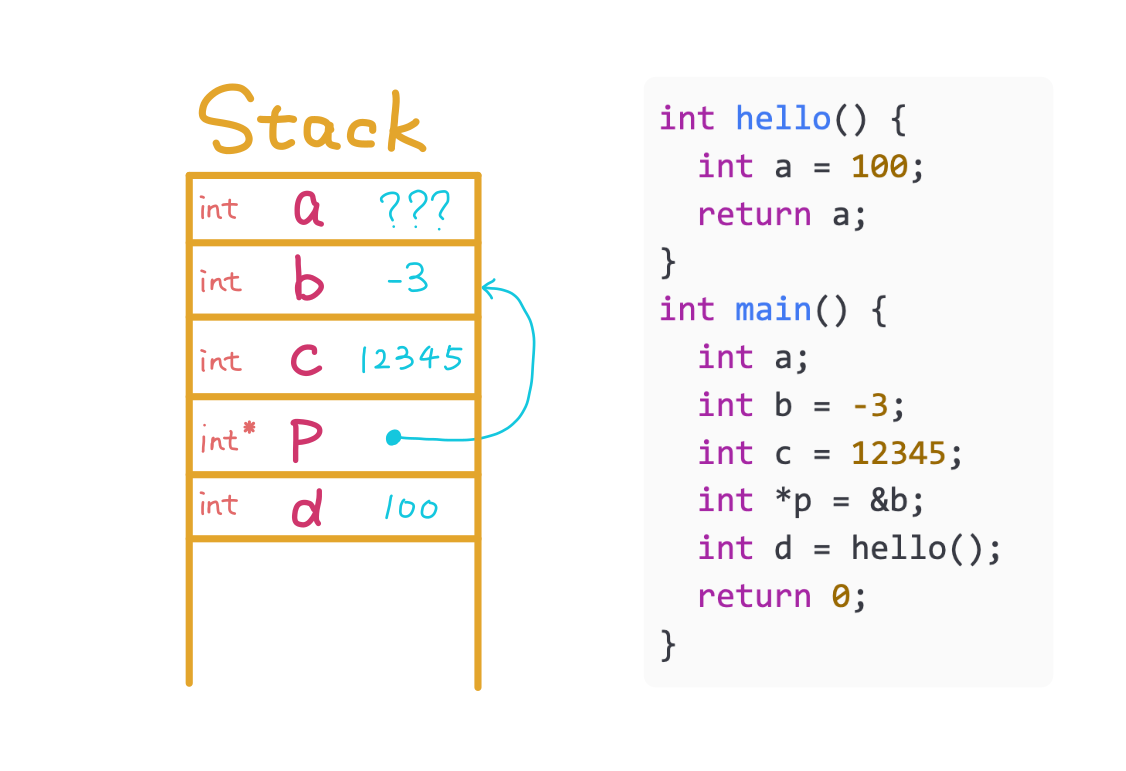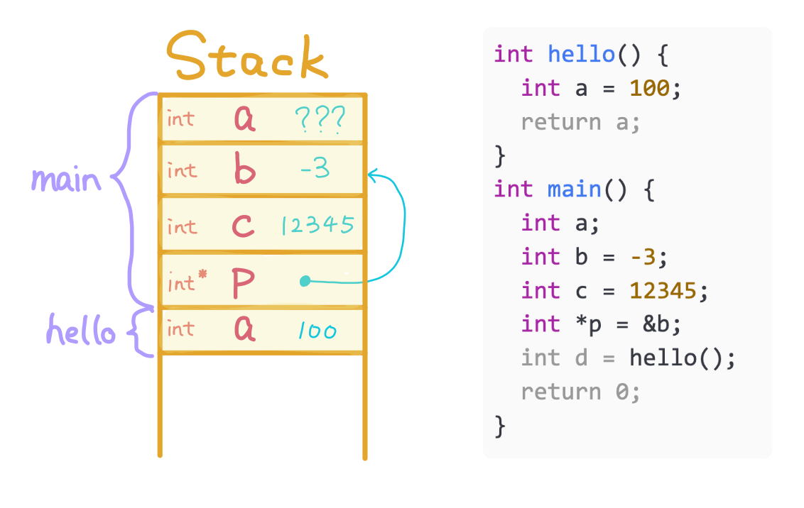 Allocate an integer with default value 0 on the heap, allocate p on main's stack to store the address of the integer